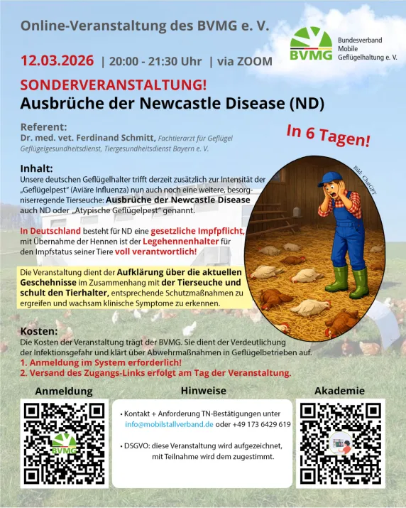 Nein, eben nicht! Denn unsere deutschen Geflügelhalter trifft derzeit - zusätzlich zur Intensität der „Geflügelpest“ (Aviäre Influenza) - nun auch noch eine weitere, besorgniserregende Tierseuche: Ausbrüche der Newcastle Disease auch ND oder „Atypische Geflügelpest“ genannt. In Deutschland besteht für ND eine gesetzliche Impfpflicht, mit Übernahme der Hennen ist der Legehennenhalter für den Impfstatus seiner Tiere voll verantwortlich!