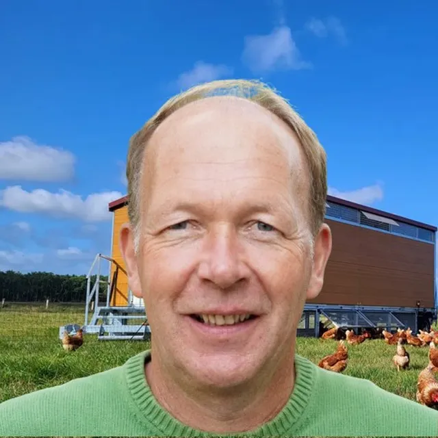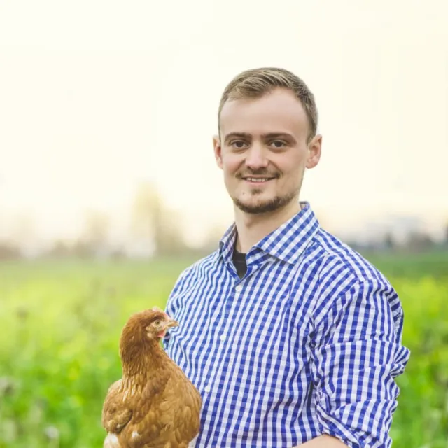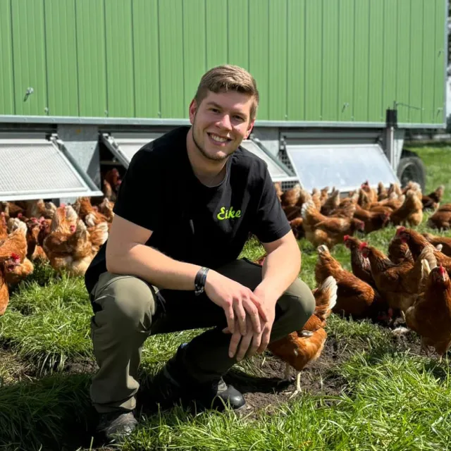 Florian Harms hält seit 2018 Legehennen in Mobilställen der Firma Weiland. Seit November 2023 ist er 1. Vorsitzender des BVMG e. V.